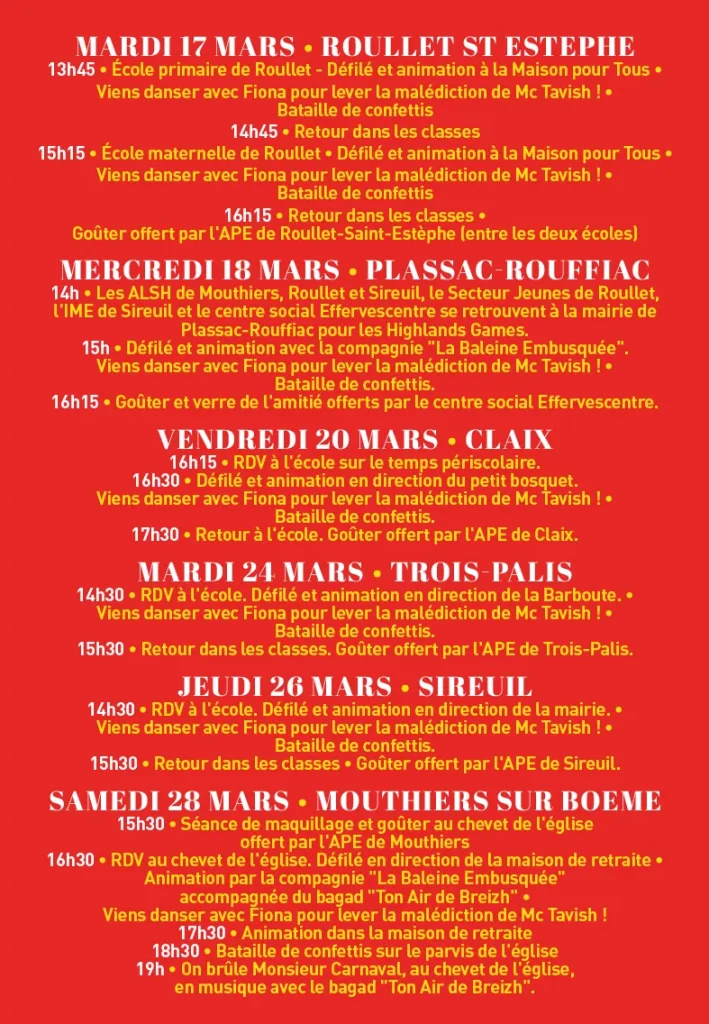 Ouvert à tous, le carnaval intercommunal « La malédiction de Mc Tavish » invite les enfants et leurs familles à vivre un grand voyage festif du 17 au 28 mars 2026 à Roullet, Plassac-Rouffiac, Claix, Trois‑Palis, Sireuil et Mouthiers-sur-Boëme. Porté par l’Association Carnaval et le centre social Effervescentre, ce rendez‑vous propose défilés, animations, spectacles et batailles de confettis dans chaque commune, pour partager un moment convivial, créatif et musical sur l’ensemble du territoire.
