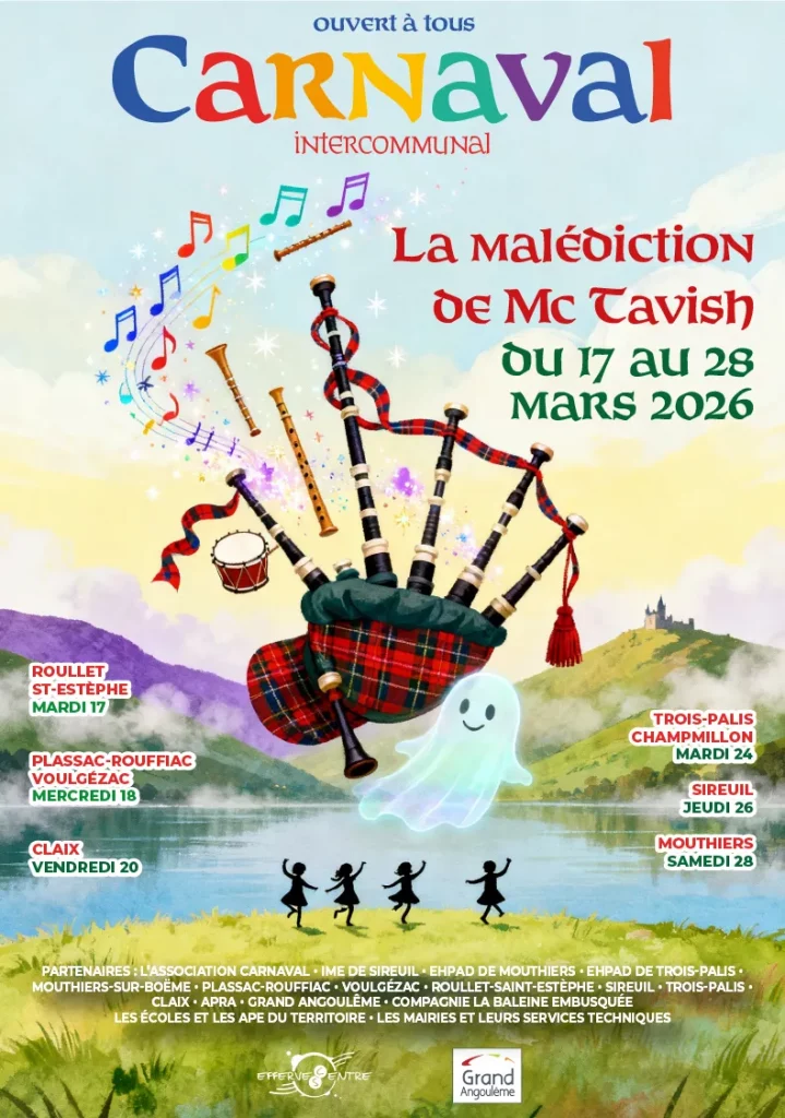 Ouvert à tous, le carnaval intercommunal « La malédiction de Mc Tavish » invite les enfants et leurs familles à vivre un grand voyage festif du 17 au 28 mars 2026 à Roullet, Plassac-Rouffiac, Claix, Trois‑Palis, Sireuil et Mouthiers-sur-Boëme. Porté par l’Association Carnaval et le centre social Effervescentre, ce rendez‑vous propose défilés, animations, spectacles et batailles de confettis dans chaque commune, pour partager un moment convivial, créatif et musical sur l’ensemble du territoire.